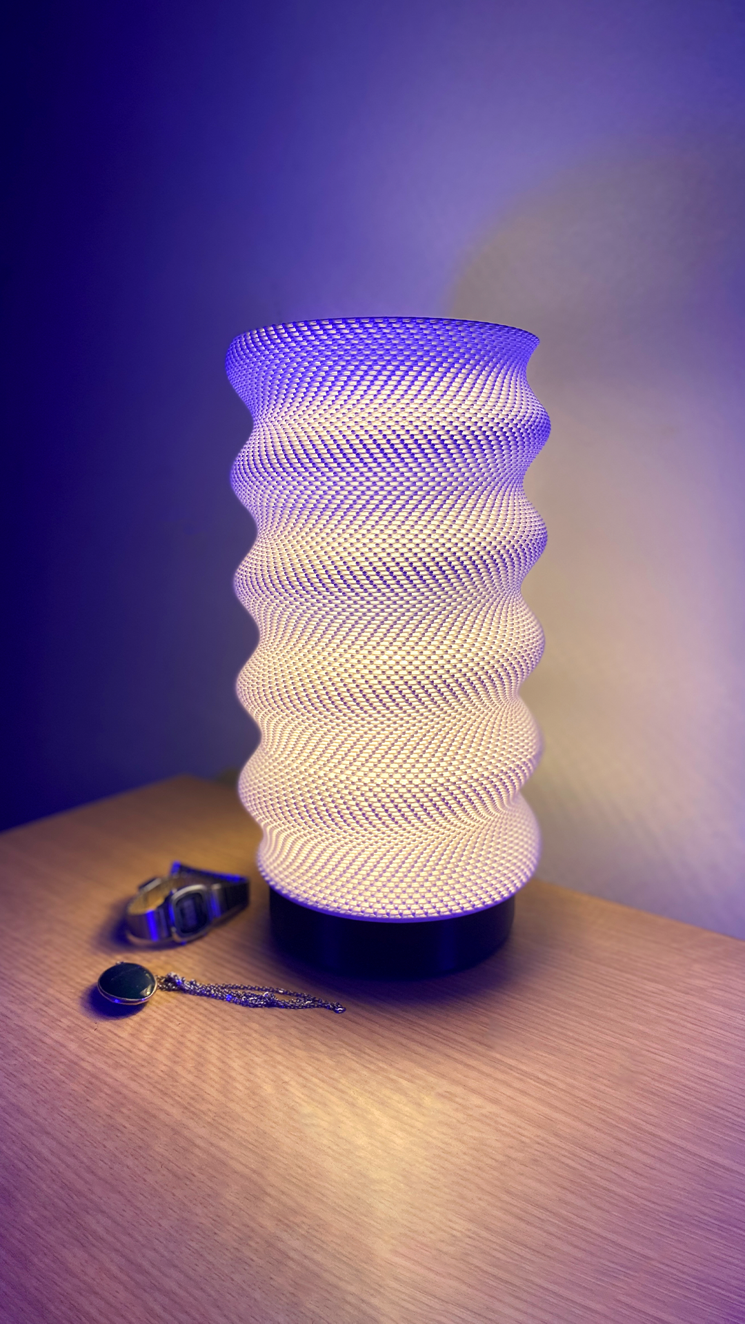 This lampshade features a unique spring mesh design that plays beautifully with light and shadow, creating a soft, elegant glow in any room. The 3D printed construction adds a contemporary twist that makes this piece truly stand out. Designed by Lunfardo made by us.